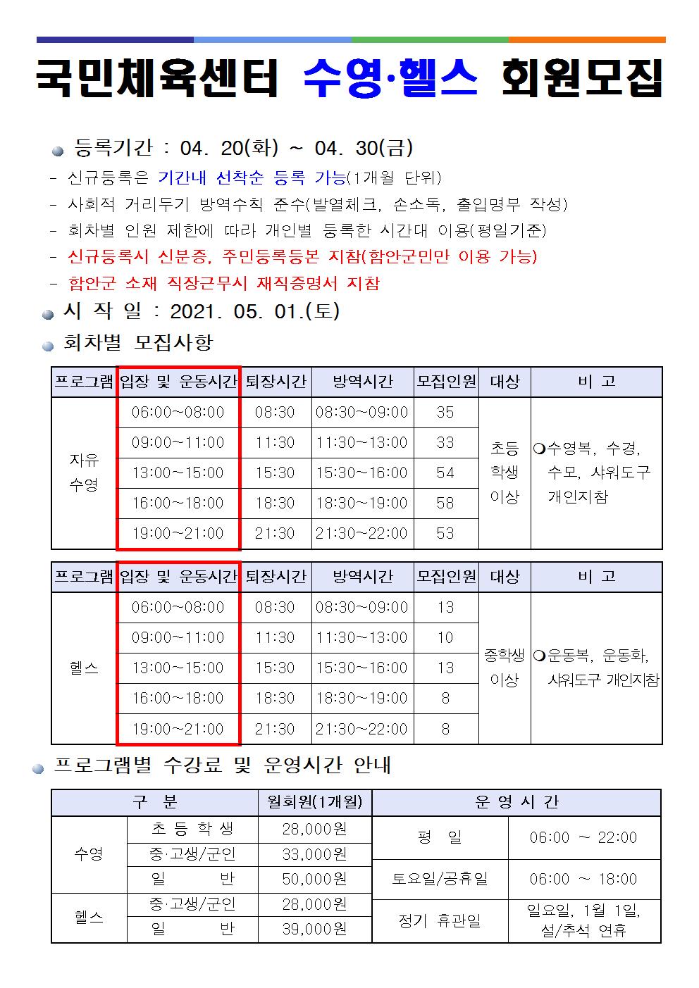 국민체육센터 05월 수영·헬스 회원모집 안내